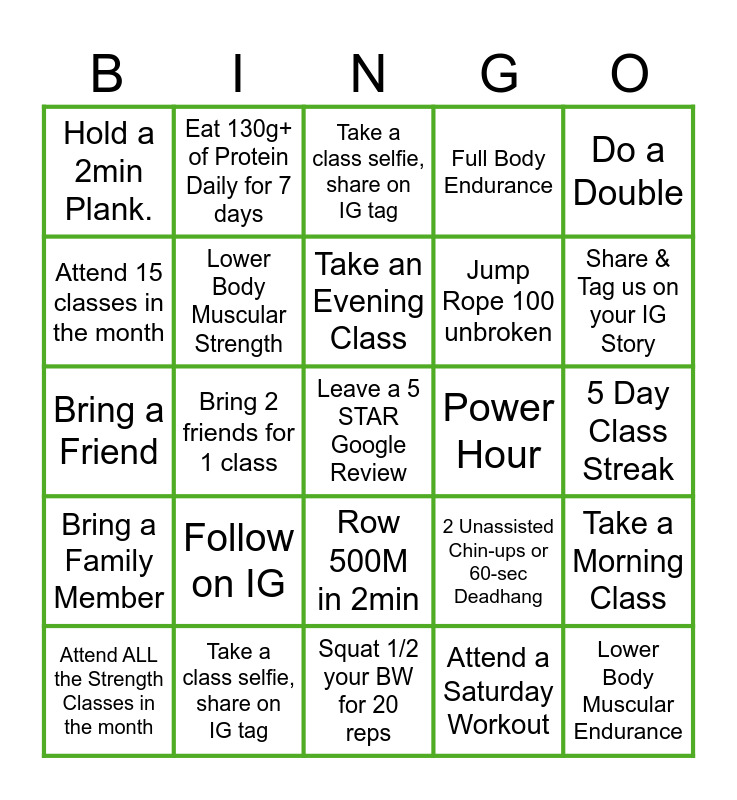 This bingo card has a free space and 32 words: Attend a Saturday Workout, Follow ALL the coaches on IG, Bring 2 friends for 1 class, "Like" us on Facebook, Bring a Family Member, Lower Body Muscular Strength, Do a Double, Take a Morning Class, Eat 130g+ of Protein Daily for 7 days, Upper Body Muscular Endurance, Take an Evening Class, Take a class selfie, share on IG tag, Bring a Friends, Full Body Endurance, Power Hour, Hold a 2min Wallsit, Attend ALL the Strength Classes in the month, Bring a Friend, Row 500M in 2min, Follow on IG, 2 Unassisted Chin-ups or 60-sec Deadhang, Lower Body Muscular Endurance, 5 Day Class Streak, Take a class selfie, share on IG tag, Lower Body Muscular Endurance, Full Body Endurance, Jump Rope 100 unbroken, Attend 15 classes in the month, Hold a 2min Plank., Squat 1/2 your BW for 20 reps, Upper Body Muscular Strength and Share & Tag us on your IG Story.