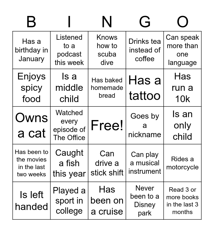 This bingo card has a free space and 24 words: Caught a fish this year, Played a sport in college, Has baked homemade bread, Is left handed, Can speak more than one language, Has a birthday in January, Enjoys spicy food, Listened to a podcast this week, Goes by a nickname, Can drive a stick shift, Has a tattoo, Owns a cat, Can play a musical instrument, Rides a motorcycle, Is a middle child, Never been to a Disney park, Is an only child, Knows how to scuba dive, Has run a 10k, Watched every episode of The Office, Read 3 or more books in the last 3 months, Has been to the movies in the last two weeks, Drinks tea instead of coffee and Has been on a cruise.