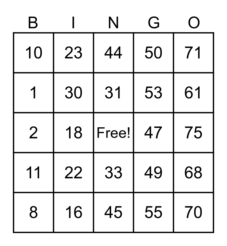 This bingo card has a free space and 24 words: 8, 22, 31, 55, 71, 10, 23, 44, 47, 75, 2, 30, 49, 68, 1, 16, 45, 50, 61, 11, 18, 33, 53 and 70.