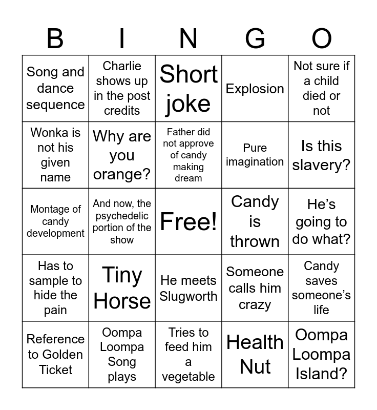This bingo card has a free space and 24 words: Tiny Horse, Oompa Loompa Song plays, Father did not approve of candy making dream, Reference to Golden Ticket, Not sure if a child died or not, Song and dance sequence, Wonka is not his given name, Charlie shows up in the post credits, Candy is thrown, He meets Slugworth, Pure imagination, Montage of candy development, Someone calls him crazy, Candy saves someone’s life, Why are you orange?, Health Nut, He’s going to do what?, Short joke, Is this slavery?, And now, the psychedelic portion of the show, Oompa Loompa Island?, Has to sample to hide the pain, Explosion and Tries to feed him a vegetable.