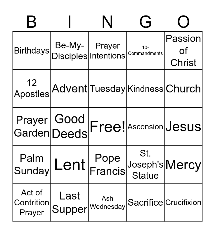 This bingo card has a free space and 29 words: Act of Contrition Prayer, Stations of the Cross, Good Deeds, Saints, Birthdays, Prayer Intentions, Advent, Lent, Ascension, Last Supper, Jesus, Crucifixion, Ash Wednesday, Sacrifice, Church, Penance, Pope Francis, Palm Sunday, Passion of Christ, Prayer Garden, St. Joseph's Statue, Operation Gratitude, Kindness, 12 Apostles, 10-Commandments, Be-My-Disciples, Mercy, Tuesday and St.Bartholomew.