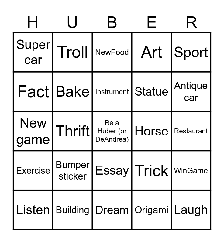 This bingo card has a free space and 37 words: Walk, Learn, PinkCar, Bake, WinGame, Bumper sticker, Instrument, Movie, Sport, Read, Thrift, Art, Laugh, Restaurant, Fact, Exercise, Drink, NewFood, Essay, Horse, Super car, Antique car, Listen, Dream, Helicopter, Origami, Troll, Puzzle, Nap, Post, Rock, Building, New game, Library, Trick, Statue and Call.