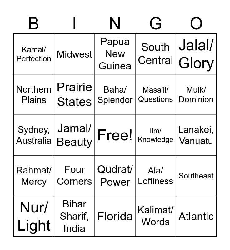 This bingo card has a free space and 48 words: Appalachia, Atlantic, California, Florida, Four Corners, Heartland, Midwest, Northeast, Northern Plains, Northwest, Prairie States, South Central, Southeast, Ala/ Loftiness, Asma/ Names, Azamat/ Grandeur, Baha/ Splendor, Ilm/ Knowledge, Izzat/ Might, Jalal/ Glory, Jamal/ Beauty, Kalimat/ Words, Kamal/ Perfection, Masa'il/ Questions, Mashiyyat/ Will, Mulk/ Dominion, Nur/ Light, Qawl/ Speech, Qudrat/ Power, Rahmat/ Mercy, Sharaf/ Honor, Sultan/ Sovereignty, Ashkabat, Turkmenistan, Battambang, Cambodia, Bihar Sharif, India, Kampala, Uganda, Kinshasa, Democratic Republic of the Congo, Lanakei, Vanuatu, Langenhain, Germany, Matunda Soy, Kenya, New Delhi, India, Panama City, Panama, Papua New Guinea, Santiago, Chile, Sydney, Australia, Tiapapata, Samoa, Villa Rica, Columbia and Wilmette, IL, USA.