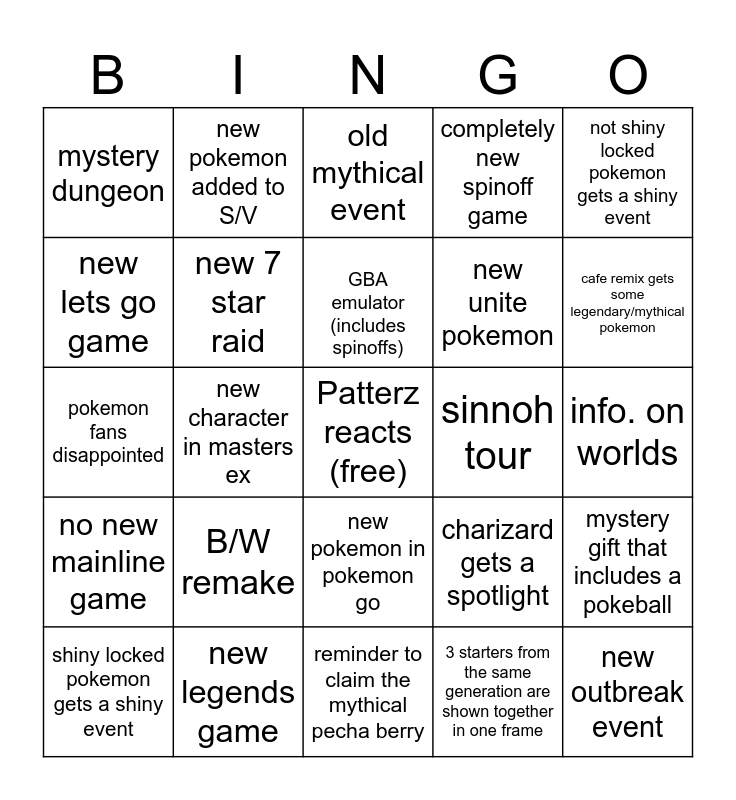 This bingo card has a free space and 24 words: B/W remake, new legends game, GBA emulator (includes spinoffs), shiny locked pokemon gets a shiny event, not shiny locked pokemon gets a shiny event, mystery dungeon, new lets go game, new pokemon added to S/V, sinnoh tour, new pokemon in pokemon go, new unite pokemon, pokemon fans disappointed, charizard gets a spotlight, mystery gift that includes a pokeball, new 7 star raid, 3 starters from the same generation are shown together in one frame, info. on worlds, old mythical event, cafe remix gets some legendary/mythical pokemon, new character in masters ex, new outbreak event, no new mainline game, completely new spinoff game and reminder to claim the mythical pecha berry.
