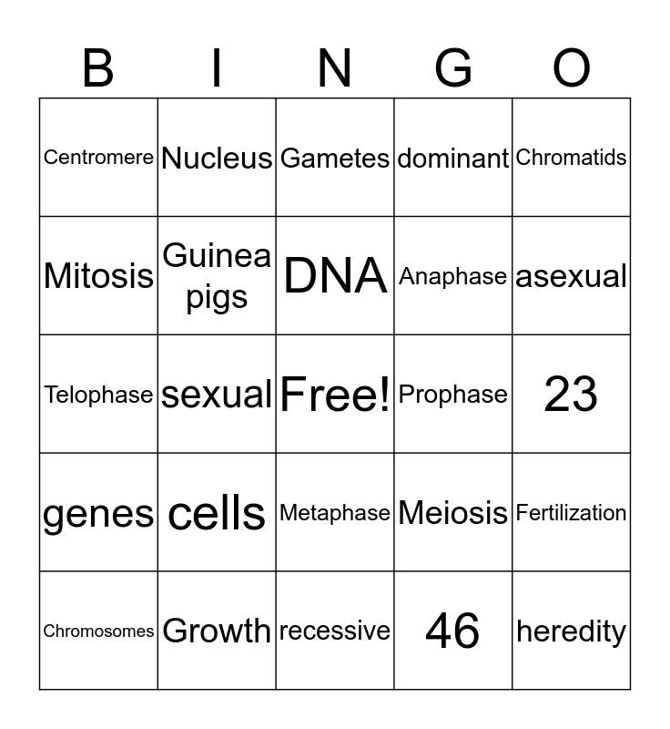 This bingo card has a free space and 24 words: cells, Growth, DNA, Chromosomes, Chromatids, Centromere, Mitosis, Nucleus, Prophase, Metaphase, Anaphase, Telophase, Meiosis, Fertilization, Guinea pigs, 46, 23, Gametes, asexual, sexual, heredity, genes, dominant and recessive.