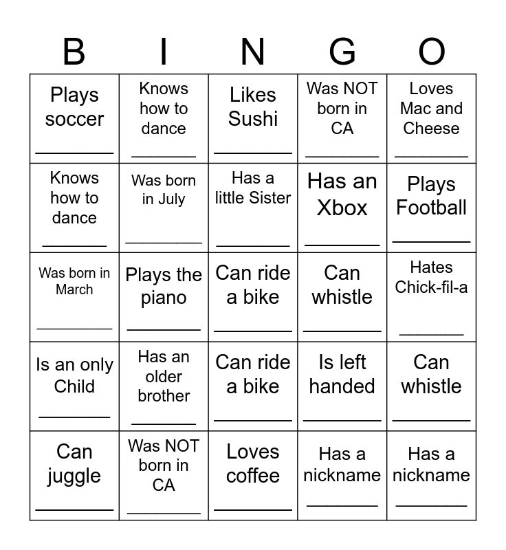 This bingo card has 33 words: Has a nickname _______, Is wearing jeans ________, Plays the piano _______, Has a Dog _______, Is an only Child _______, Was born in July _________, Loves Mac and Cheese ________, Can juggle _______, Knows how to dance _______, Hates Pizza _______, Has a little Sister ________, Likes Sushi _______, Free Space, Wrestles for school ________, Can whistle _______, Plays Football _______, Was NOT born in CA ________, Was born in March __________, Has an older brother _______, Is left handed _______, Can ride a bike _______, Speaks at least 2 languages _______, Plays soccer _______, Hates Chick-fil-a _______, Loves coffee _______, Can ride a bike _______, Was NOT born in CA ________, Has an Xbox ______, Knows how to dance _______, Can whistle _______, Enjoys Camping _______, Has a nickname _______ and Can skateboard ________.