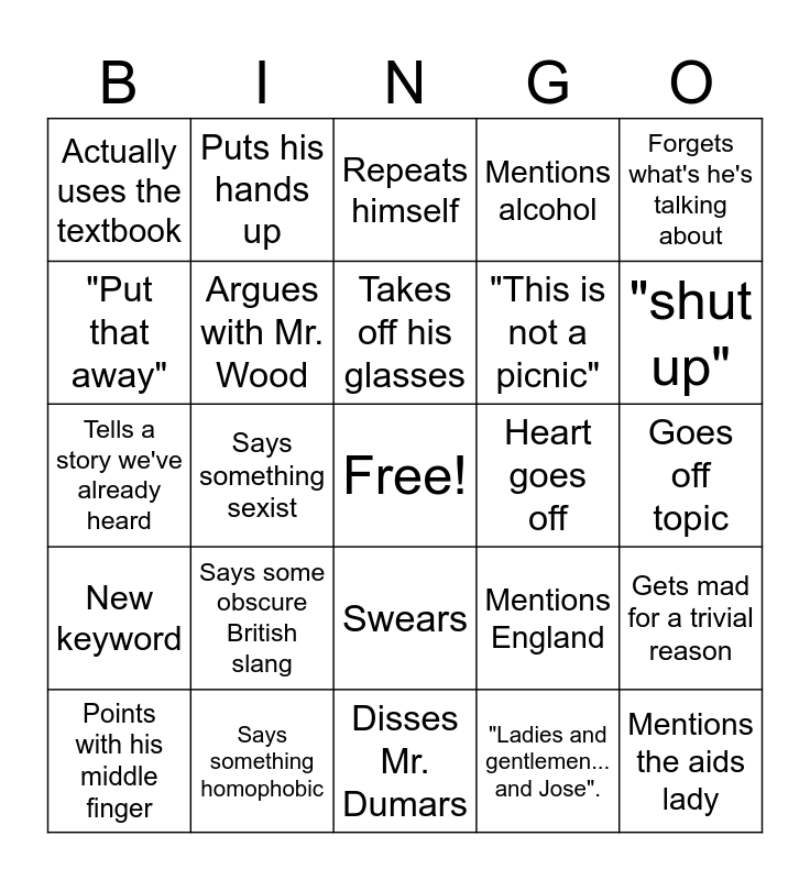 This bingo card has a free space and 24 words: Says some obscure British slang, Says something homophobic, Takes off his glasses, Points with his middle finger, Forgets what's he's talking about, Actually uses the textbook, "Put that away", Puts his hands up, Heart goes off, Swears, "This is not a picnic", Tells a story we've already heard, Mentions England, Gets mad for a trivial reason, Argues with Mr. Wood, "Ladies and gentlemen... and Jose"., Goes off topic, Repeats himself, "shut up", Says something sexist, Mentions the aids lady, New keyword, Mentions alcohol and Disses Mr. Dumars.