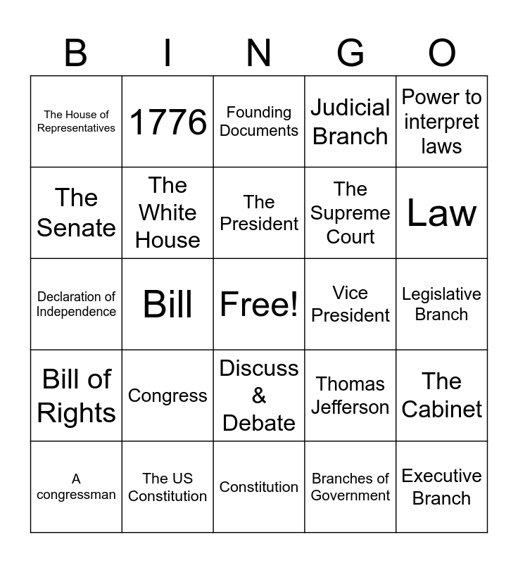 This bingo card has a free space and 24 words: Congress, The US Constitution, The President, A congressman, Power to interpret laws, The House of Representatives, The Senate, 1776, Vice President, Discuss & Debate, The Supreme Court, Declaration of Independence, Thomas Jefferson, The Cabinet, The White House, Branches of Government, Legislative Branch, Founding Documents, Law, Bill, Executive Branch, Bill of Rights, Judicial Branch and Constitution.