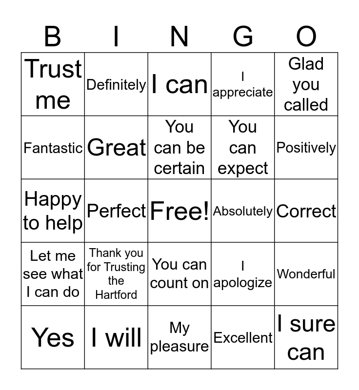 This bingo card has a free space and 24 words: Thank you for Trusting the Hartford, I will, You can be certain, Yes, Glad you called, Trust me, Fantastic, Definitely, Absolutely, You can count on, You can expect, Happy to help, I apologize, Wonderful, Great, Excellent, Correct, I can, Positively, Perfect, I sure can, Let me see what I can do, I appreciate and My pleasure.