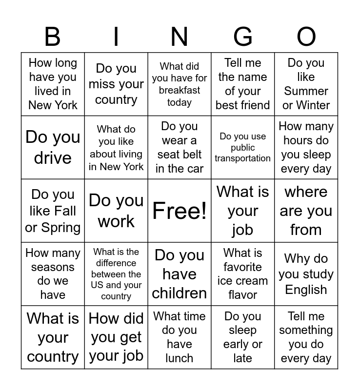 This bingo card has a free space and 29 words: What is your country, Where do you live, Do you work, How many siblings do you have, How long have you lived in New York, What did you have for breakfast today, What do you like about living in New York, What is the difference between the US and your country, What is your job, How did you get your job, where are you from, Tell me something you do every day, What time do you have lunch, Do you sleep early or late, How many hours do you sleep every day, Do you work on weekends, Do you have children, How many seasons do we have, Do you like Summer or Winter, Do you like Fall or Spring, What is favorite ice cream flavor, How do you get to school, Do you use public transportation, Do you drive, Tell me the name of your best friend, Do you miss your country, Why do you study English, Do you wear a seat belt in the car and tell me your first name.