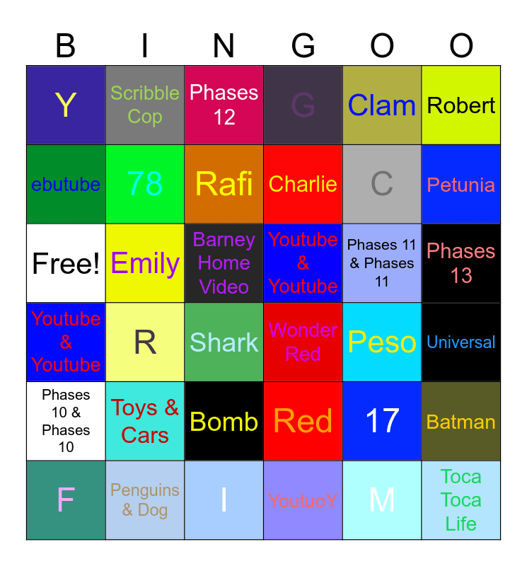 This bingo card has 36 words: Red, Bomb, YoutuoY, ebutube, Youtube & Youtube, Youtube & Youtube, 78, I, Clam, 17, Petunia, G, Batman, Emily, Charlie, Y, Phases 10 & Phases 10, Phases 11 & Phases 11, Free!, Phases 12, Barney Home Video, R, Wonder Red, Shark, Peso, Scribble Cop, C, Penguins & Dog, Rafi, Robert, Toca Toca Life, F, Universal, Phases 13, Toys & Cars and M.