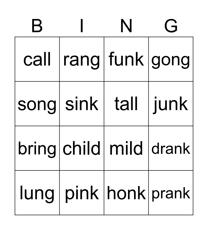 This bingo card has 16 words: pink, drank, funk, call, bring, rang, mild, honk, song, sink, lung, gong, child, junk, tall and prank.