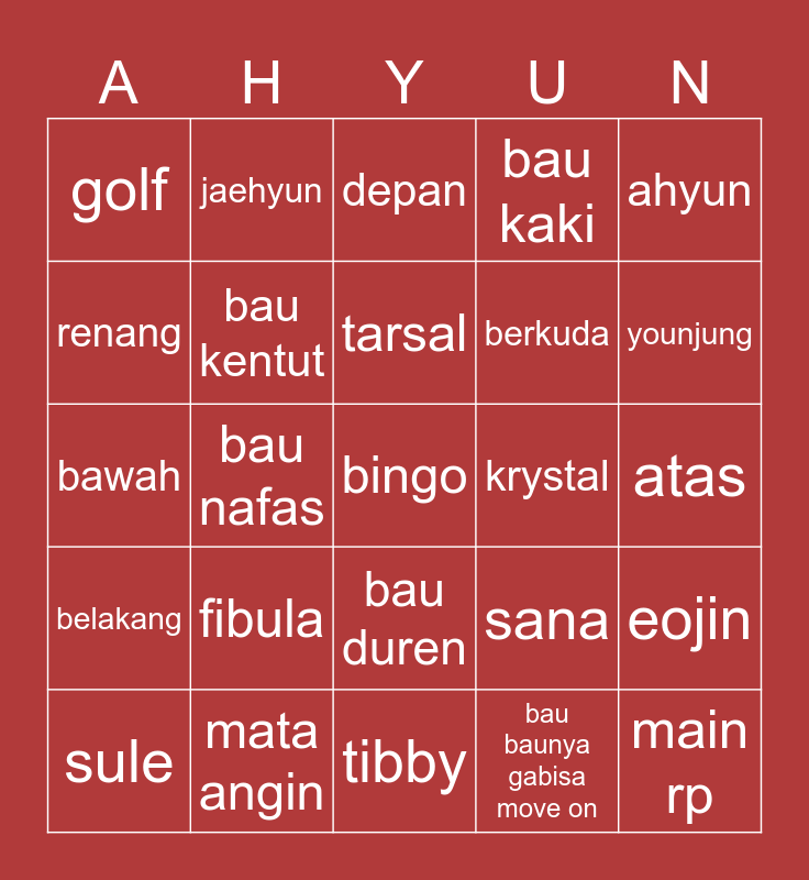 This bingo card has 25 words: fibula, tibby, tarsal, sule, ahyun, golf, renang, jaehyun, krystal, bau duren, berkuda, bawah, sana, eojin, bau kentut, main rp, atas, depan, younjung, bau nafas, bingo, mata angin, belakang, bau kaki and bau baunya gabisa move on.