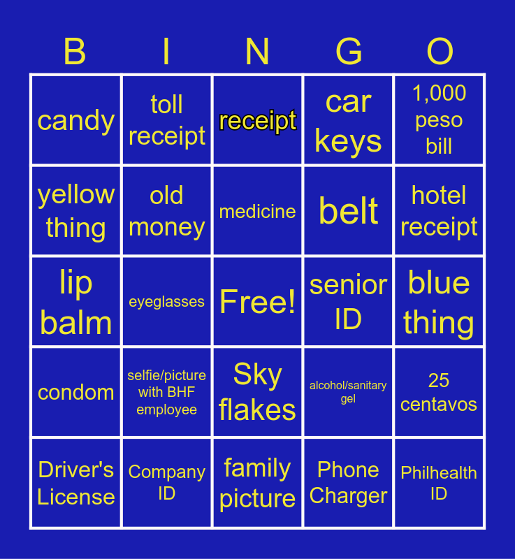 This bingo card has a free space and 24 words: Driver's License, selfie/picture with BHF employee, medicine, Phone Charger, 1,000 peso bill, candy, toll receipt, receipt, senior ID, blue thing, lip balm, old money, alcohol/sanitary gel, 25 centavos, yellow thing, Company ID, family picture, car keys, hotel receipt, condom, eyeglasses, Sky flakes, belt and Philhealth ID.