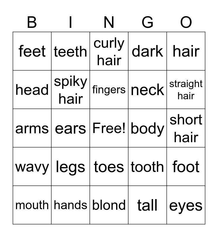 This bingo card has a free space and 24 words: legs, hands, fingers, mouth, hair, feet, head, teeth, body, toes, neck, arms, tooth, foot, spiky hair, tall, short hair, curly hair, straight hair, ears, eyes, wavy, dark and blond.