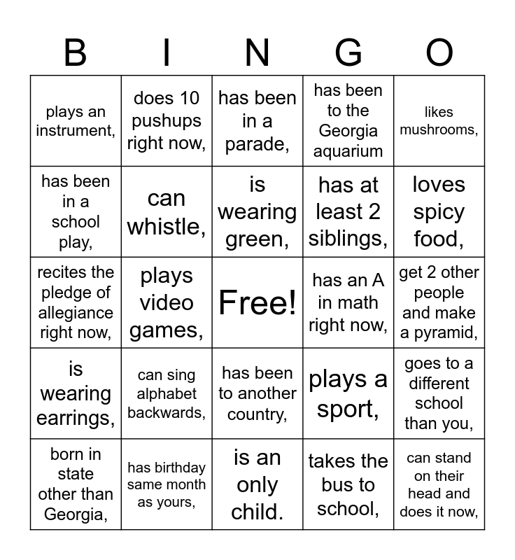 This bingo card has a free space and 24 words: can sing alphabet backwards,, has birthday same month as yours,, is wearing green,, born in state other than Georgia,, likes mushrooms,, plays an instrument,, has been in a school play,, does 10 pushups right now,, has an A in math right now,, has been to another country,, has at least 2 siblings,, recites the pledge of allegiance right now,, plays a sport,, goes to a different school than you,, can whistle,, takes the bus to school,, get 2 other people and make a pyramid,, has been in a parade,, loves spicy food,, plays video games,, can stand on their head and does it now,, is wearing earrings,, has been to the Georgia aquarium and is an only child..