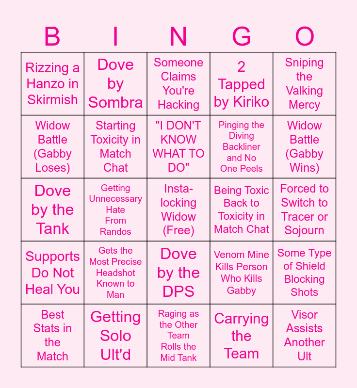 This bingo card has a free space and 24 words: Gets the Most Precise Headshot Known to Man, Getting Solo Ult'd, "I DON'T KNOW WHAT TO DO", Best Stats in the Match, Sniping the Valking Mercy, Rizzing a Hanzo in Skirmish, Widow Battle (Gabby Loses), Dove by Sombra, Being Toxic Back to Toxicity in Match Chat, Dove by the DPS, Pinging the Diving Backliner and No One Peels, Dove by the Tank, Venom Mine Kills Person Who Kills Gabby, Some Type of Shield Blocking Shots, Starting Toxicity in Match Chat, Carrying the Team, Forced to Switch to Tracer or Sojourn, Someone Claims You're Hacking, Widow Battle (Gabby Wins), Getting Unnecessary Hate From Randos, Visor Assists Another Ult, Supports Do Not Heal You, 2 Tapped by Kiriko and Raging as the Other Team Rolls the Mid Tank.