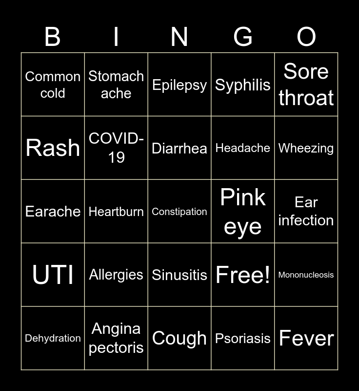 This bingo card has 25 words: Allergies, Cough, Diarrhea, Dehydration, Sore throat, Common cold, Rash, Stomach ache, Pink eye, Sinusitis, Headache, Earache, Free!, Mononucleosis, COVID-19, Fever, Ear infection, Epilepsy, Wheezing, Heartburn, Constipation, Angina pectoris, UTI, Syphilis and Psoriasis.