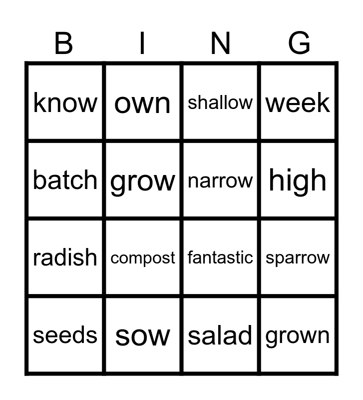 This bingo card has 25 words: three, way, high, lay, batch, know, grow, own, sow, bowl, radish, fantastic, away, window, narrow, packet, salad, shallow, compost, sparrow, seeds, rows, grown, week and slowly.