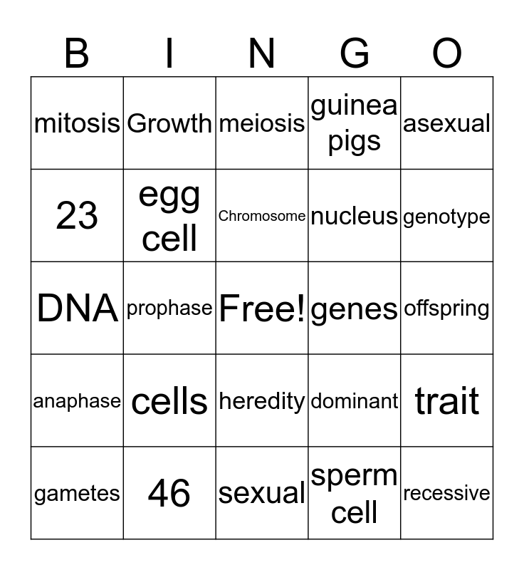 This bingo card has a free space and 24 words: cells, 46, Chromosome, gametes, asexual, mitosis, 23, Growth, genes, heredity, nucleus, DNA, dominant, trait, egg cell, sperm cell, offspring, meiosis, genotype, prophase, recessive, anaphase, guinea pigs and sexual.