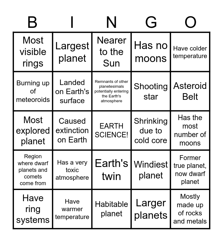 This bingo card has a free space and 43 words: Formed first during the formation of the solar system, Mostly made up of rocks and metals, Mostly made up of ice, dusts, and gas, Have ring systems, Smaller planets, Larger planets, Nearer to the Sun, Farther from the Sun, Have colder temperature, Have warmer temperature, Has no moons, Shrinking due to cold core, Earth's twin, Has a very toxic atmosphere, Morning or Evening Star, Habitable planet, Red planet, Most explored planet, Olympus Mons, Asteroid Belt, Largest planet, Failed Star, Great Red Spot, Most visible rings, Unusual tilt, Has the most number of moons, Least explored planet, High in methane resulting in stinky odor, Windiest planet, Region where dwarf planets and comets come from, Beyond Neptune, Former true planet, now dwarf planet, Planet named after a Filipina biologist, Caused extinction on Earth, Rocky planetesimals thought to bring water on Earth, Have coma and tails, Has a rocky nuclei, and icy coma, Remnants of other planetesimals potentially entering the Earth's atmosphere, Burning up of meteoroids, Shooting star, Used to study minerals from outer space, Landed on Earth's surface and May be as small as a pebble or large enough to cause injuries.