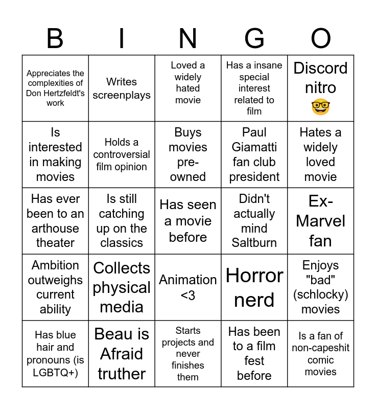 This bingo card has a free space and 24 words: Collects physical media, Beau is Afraid truther, Buys movies pre-owned, Has blue hair and pronouns (is LGBTQ+), Discord nitro 🤓, Appreciates the complexities of Don Hertzfeldt's work, Is interested in making movies, Writes screenplays, Didn't actually mind Saltburn, Animation <3, Paul Giamatti fan club president, Has ever been to an arthouse theater, Horror nerd, Enjoys "bad" (schlocky) movies, Holds a controversial film opinion, Has been to a film fest before, Ex-Marvel fan, Loved a widely hated movie, Hates a widely loved movie, Is still catching up on the classics, Is a fan of non-capeshit comic movies, Ambition outweighs current ability, Has a insane special interest related to film and Starts projects and never finishes them.
