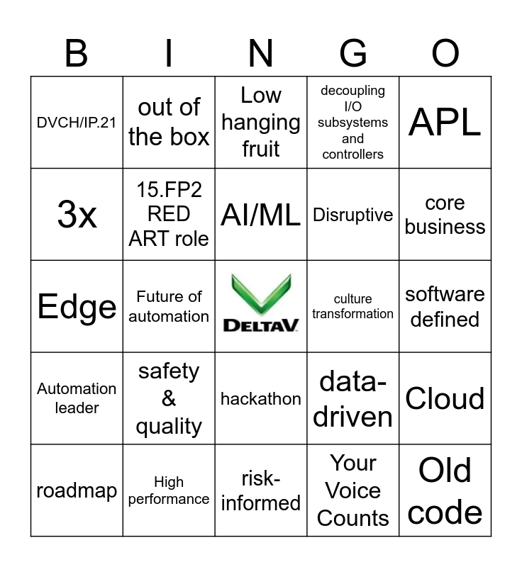 This bingo card has a free space and 40 words: "Legacy" word used, Edge, seed is growing, 15.FP2 RED ART role, High performance, hackathon, AI/ML, Tech debt, APL, Automation leader, Future of automation, decoupling I/O subsystems and controllers, Old code, software defined, culture transformation, safety & quality, Innovation, DVCH/IP.21, Reduce bug backlog, Low hanging fruit, Cloud, Your Voice Counts, Disruptive, 3x, best practices, take it offline, mission critical, lessons learned, strategic focus area(s), value add, metric, roadmap, bottom line, data-driven, core business, risk-informed, milestone, action item, out of the box and challenge.
