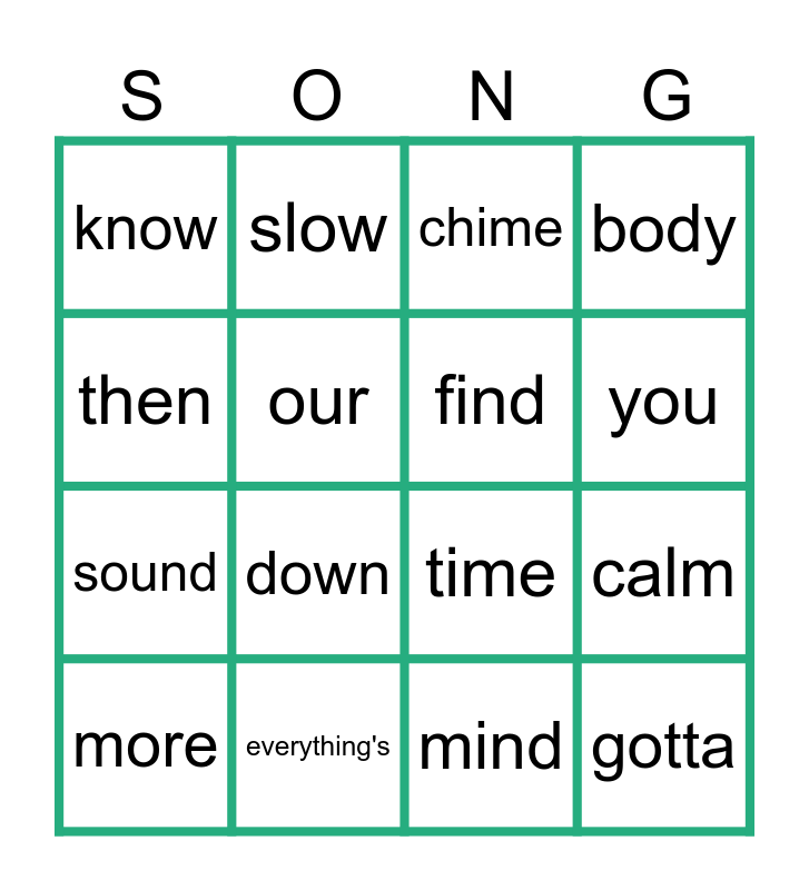 This bingo card has 23 words: gotta, stop, you, that's, then, know, our, slow, more, breathe, down, sound, you, know, everything's, fine, chime, time, find, calm, body, mind and listen.