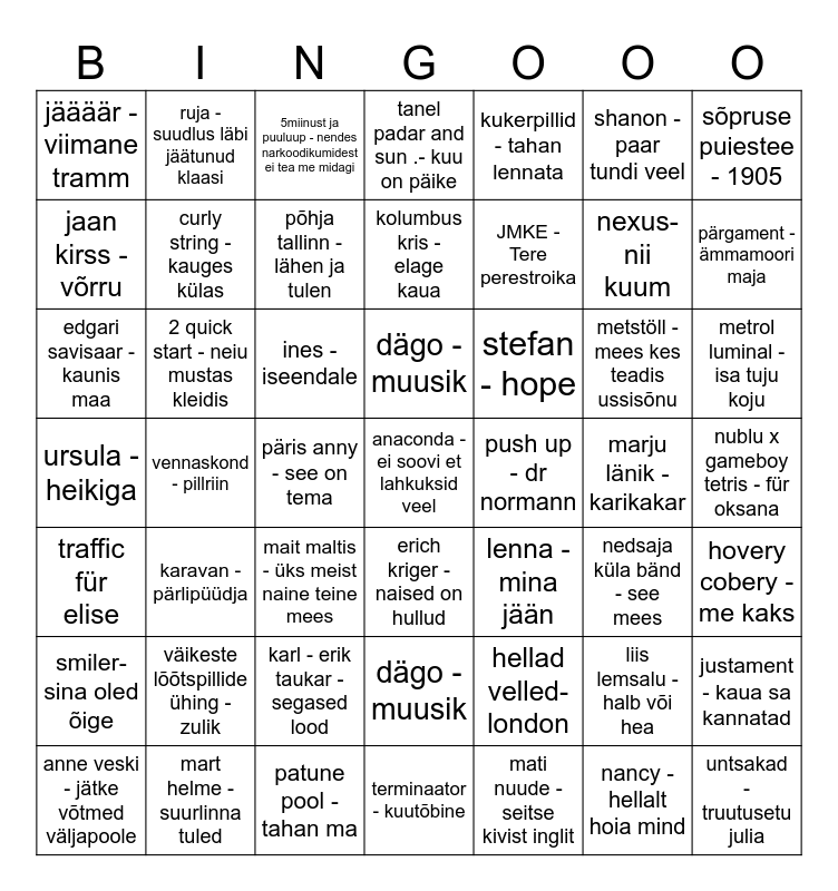 This bingo card has 49 words: smiler-sina oled õige, 2 quick start - neiu mustas kleidis, karl - erik taukar - segased lood, erich kriger - naised on hullud, stefan - hope, marju länik - karikakar, sõpruse puiestee - 1905, anne veski - jätke võtmed väljapoole, curly string - kauges külas, päris anny - see on tema, kolumbus kris - elage kaua, kukerpillid - tahan lennata, nexus- nii kuum, metrol luminal - isa tuju koju, traffic für elise, karavan - pärlipüüdja, 5miinust ja puuluup - nendes narkoodikumidest ei tea me midagi, dägo - muusik, mati nuude - seitse kivist inglit, shanon - paar tundi veel, pärgament - ämmamoori maja, jaan kirss - võrru, ruja - suudlus läbi jäätunud klaasi, põhja tallinn - lähen ja tulen, terminaator - kuutõbine, JMKE - Tere perestroika, metstöll - mees kes teadis ussisõnu, justament - kaua sa kannatad, jäääär - viimane tramm, vennaskond - pillriin, patune pool - tahan ma, dägo - muusik, lenna - mina jään, liis lemsalu - halb või hea, nublu x gameboy tetris - für oksana, ursula - heikiga, väikeste lõõtspillide ühing - zulik, mait maltis - üks meist naine teine mees, anaconda - ei soovi et lahkuksid veel, push up - dr normann, nancy - hellalt hoia mind, hovery cobery - me kaks, edgari savisaar - kaunis maa, mart helme - suurlinna tuled, ines - iseendale, tanel padar and sun .- kuu on päike, hellad velled- london, nedsaja küla bänd - see mees and untsakad - truutusetu julia.