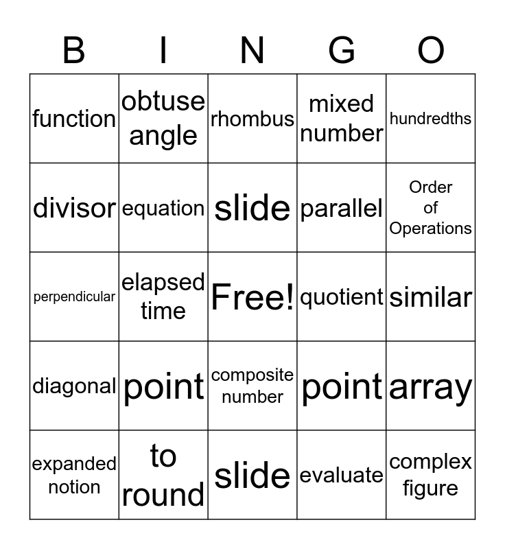 This bingo card has a free space and 24 words: point, to round, slide, expanded notion, hundredths, function, divisor, obtuse angle, quotient, composite number, parallel, perpendicular, point, array, equation, evaluate, similar, rhombus, Order of Operations, elapsed time, complex figure, diagonal, mixed number and slide.