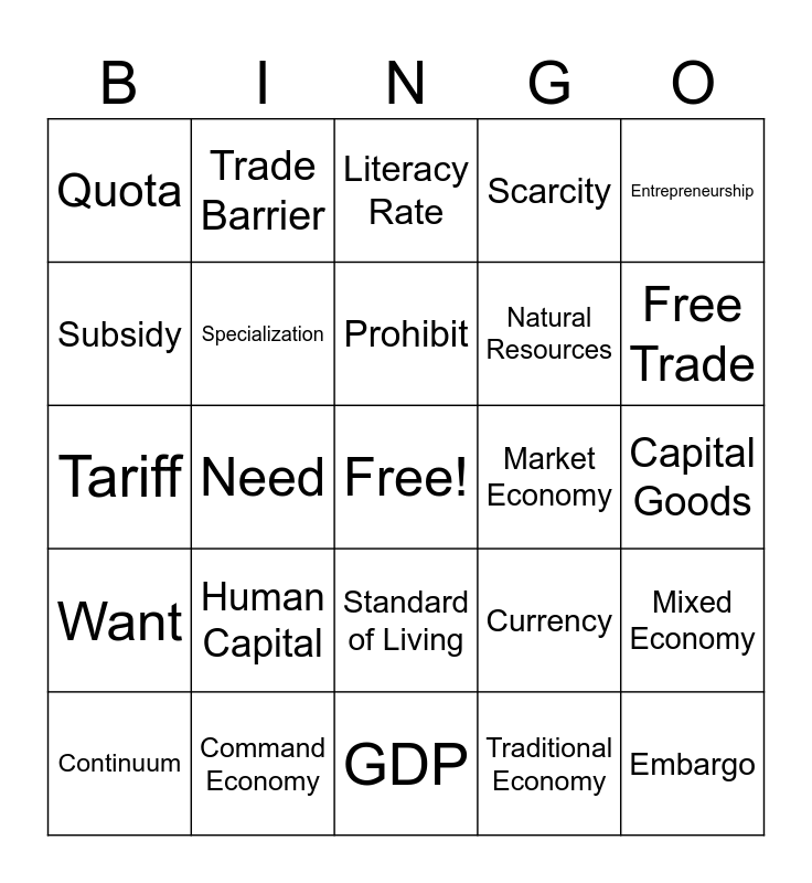 This bingo card has a free space and 24 words: Human Capital, Command Economy, Prohibit, Continuum, Entrepreneurship, Quota, Subsidy, Trade Barrier, Market Economy, Standard of Living, Natural Resources, Tariff, Currency, Mixed Economy, Specialization, Traditional Economy, Capital Goods, Literacy Rate, Free Trade, Need, Embargo, Want, Scarcity and GDP.