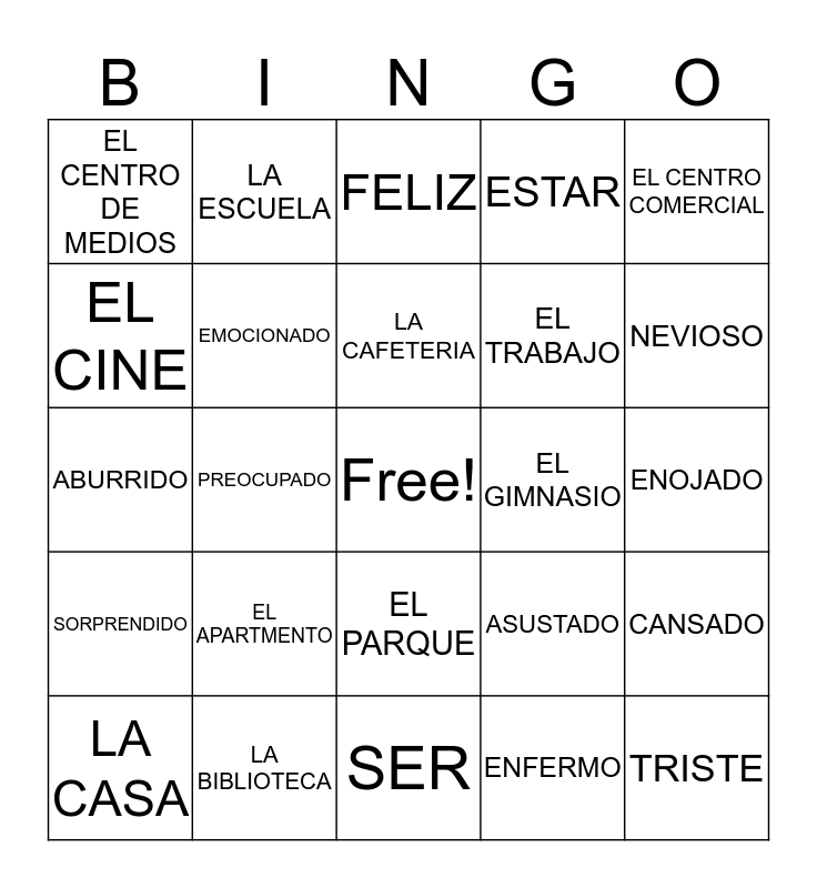 This bingo card has a free space and 24 words: EL APARTMENTO, LA BIBLIOTECA, LA CAFETERIA, LA CASA, EL CENTRO COMERCIAL, EL CENTRO DE MEDIOS, EL CINE, LA ESCUELA, EL GIMNASIO, EL PARQUE, EL TRABAJO, ABURRIDO, ASUSTADO, CANSADO, EMOCIONADO, ENFERMO, ENOJADO, FELIZ, NEVIOSO, PREOCUPADO, TRISTE, SORPRENDIDO, ESTAR and SER.