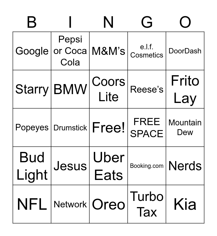 This bingo card has a free space and 36 words: A Movie Premier, Avocados from Mexico, BetMGM, BMW, Booking.com, Bud Light, Coors Lite, Disney, DoorDash, Draft Kings, Drumstick, e.l.f. Cosmetics, FanDuel, FREE SPACE, Frito Lay, Google, Hellman’s, Jesus, Kia, M&M’s, Mountain Dew, Nerds, Network, NFL, Oreo, Pepsi or Coca Cola, Popeyes, Pringles, Reese’s, Starry, T Mobile, Toyoda, Turbo Tax, Uber Eats, Volkswagen and Weather Tech.