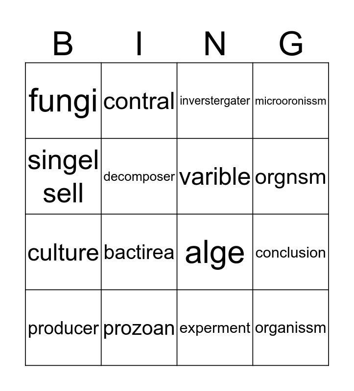 This bingo card has a free space and 15 words: producer, organissm, inverstergater, fungi, orgnsm, singel sell, bactirea, experment, decomposer, culture, conclusion, microoronissm, varible, contral and prozoan.