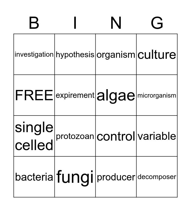 This bingo card has a free space and 15 words: bacteria, decomposer, organism, investigation, microrganism, FREE, protozoan, producer, expirement, single celled, variable, culture, algae, hypothesis and fungi.