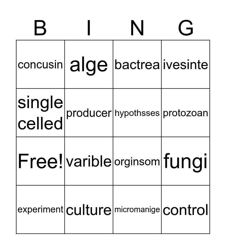 This bingo card has a free space and 15 words: experiment, control, bactrea, concusin, protozoan, single celled, varible, micromanige, producer, Free!, fungi, ivesinte, hypothsses, alge and culture.