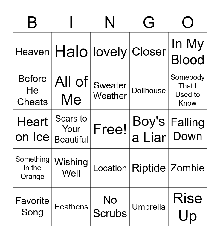 This bingo card has a free space and 24 words: Wishing Well, Heathens, Sweater Weather, Favorite Song, In My Blood, Heaven, Before He Cheats, Halo, Boy's a Liar, Location, Dollhouse, Heart on Ice, Riptide, Zombie, All of Me, Umbrella, Falling Down, lovely, Somebody That I Used to Know, Scars to Your Beautiful, Rise Up, Something in the Orange, Closer and No Scrubs.