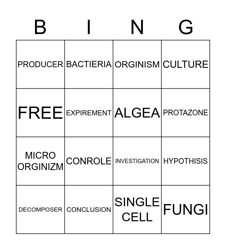 This bingo card has a free space and 15 words: DECOMPOSER, FUNGI, ORGINISM, PRODUCER, PROTAZONE, FREE, CONROLE, SINGLE CELL, EXPIREMENT, MICRO ORGINIZM, HYPOTHISIS, CULTURE, ALGEA, BACTIERIA and CONCLUSION.