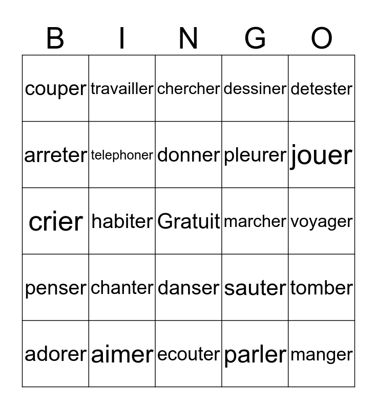 This bingo card has a free space and 24 words: chanter, aimer, donner, adorer, detester, couper, arreter, travailler, marcher, danser, pleurer, crier, sauter, tomber, telephoner, parler, voyager, chercher, jouer, habiter, manger, penser, dessiner and ecouter.