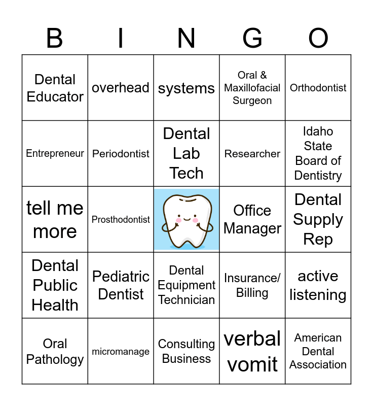 This bingo card has a free space and 39 words: Certified Dental Assistant, American Dental Hygienist Association, Expanded Function Dental Assistant, Periodontist, Oral Pathology, Dental Equipment Technician, Dental Lab Tech, Endodontist, Orthodontist, Dental Public Health, Prosthodontist, Oral & Maxillofacial Surgeon, American Dental Association, Dental Supply Rep, Office Manager, Pediatric Dentist, General Dentist, Dental Educator, Dental Receptionist, Insurance/ Billing, Entrepreneur, Consulting Business, Researcher, Idaho State Board of Dentistry, Culture, Accountability, talkover, communication, leadership, overhead, micromanage, teamwork, systems, micromanage, verbal vomit, feel-felt-found, active listening, tell me more and on-boarding.