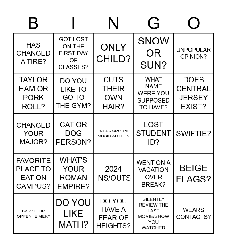 This bingo card has 25 words: WHAT'S YOUR ROMAN EMPIRE?, DO YOU HAVE A FEAR OF HEIGHTS?, CUTS THEIR OWN HAIR?, BARBIE OR OPPENHEIMER?, UNPOPULAR OPINION?, HAS CHANGED A TIRE?, TAYLOR HAM OR PORK ROLL?, GOT LOST ON THE FIRST DAY OF CLASSES?, LOST STUDENT ID?, 2024 INS/OUTS, WHAT NAME WERE YOU SUPPOSED TO HAVE?, CHANGED YOUR MAJOR?, WENT ON A VACATION OVER BREAK?, BEIGE FLAGS?, DO YOU LIKE TO GO TO THE GYM?, WEARS CONTACTS?, SWIFTIE?, ONLY CHILD?, DOES CENTRAL JERSEY EXIST?, CAT OR DOG PERSON?, UNDERGROUND MUSIC ARTIST?, DO YOU LIKE MATH?, FAVORITE PLACE TO EAT ON CAMPUS?, SNOW OR SUN? and SILENTLY REVIEW THE LAST MOVIE/SHOW YOU WATCHED.