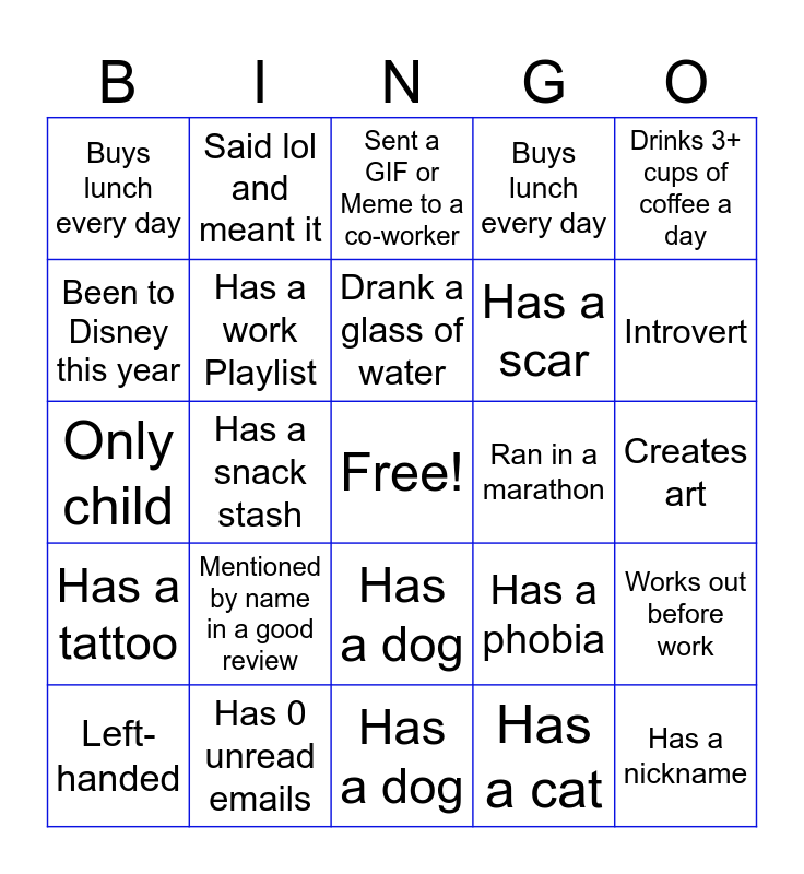 ⚠ This card has duplicate items: Did household chores on your break (2), Took a coffee break (2), Sent a GIF or Meme to a co-worker (2), Did chair yoga (2), Wore pajama bottoms to a video meeting (2), Spotted a pet in the background of your video meeting (2), "Can you hear me" (2), Said lol and meant it (2), Met a celebrity (2), Has Taken a cruise (2), Has a work Playlist (2), Has 0 unread emails (2), Buys lunch every day (2), Left-handed (2), Attended a concert last year (2), Has a BFF from high school (2), Listens to podcasts (2), Has a scar (2), Has a nickname (2), Has a snack stash (2), Drinks 3+ cups of coffee a day (2), Has a messy desk (2), Works out before work (2), Works out after work (2), Mentioned by name in a good review (2), Going on vacation soon (2), Led a project (2), Only child (2), Comes from a big family (2), Has an exotic pet (2), Has a dog (2), Has a cat (2), Has a tattoo (2), Introvert (2), Extrovert (2), Creates art (2), Has a sweet tooth (2)
