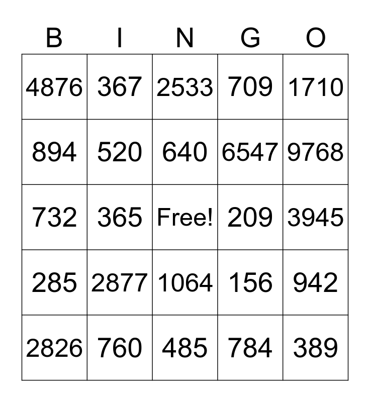 This bingo card has a free space and 24 words: 2877, 760, 640, 2826, 1710, 4876, 894, 367, 209, 1064, 6547, 732, 156, 942, 520, 784, 3945, 2533, 9768, 365, 389, 285, 709 and 485.