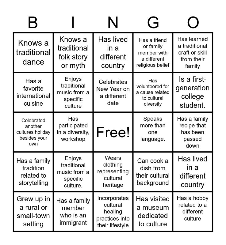 This bingo card has a free space and 24 words: Enjoys traditional music from a specific culture., Has a family member who is an immigrant, Celebrates New Year on a different date, Grew up in a rural or small-town setting, Has learned a traditional craft or skill from their family, Knows a traditional dance, Has a favorite international cuisine, Knows a traditional folk story or myth, Speaks more than one language., Wears clothing representing cultural heritage, Has volunteered for a cause related to cultural diversity, Celebrated another cultures holiday besides your own, Can cook a dish from their cultural background, Has lived in a different country, Enjoys traditional music from a specific culture, Has visited a museum dedicated to culture, Has a family recipe that has been passed down, Has lived in a different country, Is a first-generation college student., Has participated in a diversity, workshop, Has a hobby related to a different culture, Has a family tradition related to storytelling, Has a friend or family member with a different religious belief and Incorporates cultural healing practices into their lifestyle.
