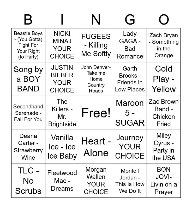 This bingo card has a free space and 27 words: Journey YOUR CHOICE, DUET, Garth Brooks - Friends in Low Places, Morgan Wallen YOUR CHOICE, Song by a BOY BAND, FUGEES - Killing Me Softly, NICKI MINAJ YOUR CHOICE, Deana Carter - Strawberry Wine, Maroon 5 - SUGAR, Miley Cyrus - Party in the USA, Secondhand Serenade - Fall For You, Lady GAGA - Bad Romance, TLC - No Scrubs, Fleetwood Mac - Dreams, Cold Play - Yellow, OUTKAST - HEY YA!, JUSTIN BIEBER YOUR CHOICE, John Denver- Take me Home Country Roads, Vanilla Ice - Ice Ice Baby, Beastie Boys - (You Gotta) Fight For Your Right (to Party), Zac Brown Band - Chicken Fried, Montell Jordan - This Is How We Do It, The Killers - Mr. Brightside, BON JOVI- Livin on a Prayer, Heart - Alone, Zach Bryan - Something in the Orange and TAYLOR SWIFT YOUR CHOICE.