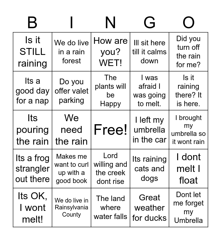 This bingo card has a free space and 24 words: Makes me want to curl up with a good book, We do live in Rainsylvania County, The plants will be Happy, Its OK, I wont melt!, Did you turn off the rain for me?, Is it STILL raining, Its a good day for a nap, We do live in a rain forest, I left my umbrella in the car, Lord willing and the creek dont rise, I was afraid I was going to melt., Its pouring the rain, Its raining cats and dogs, I dont melt I float, Do you offer valet parking, Great weather for ducks, I brought my umbrella so it wont rain, How are you? WET!, Is it raining there? It is here., We need the rain, Dont let me forget my Umbrella, Its a frog strangler out there, Ill sit here till it calms down and The land where water falls.