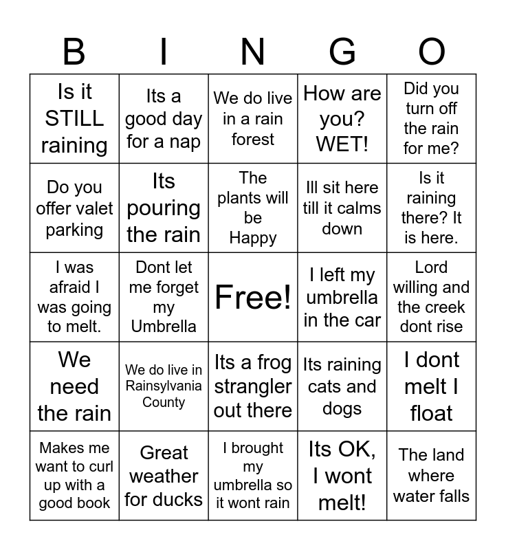 This bingo card has a free space and 24 words: Makes me want to curl up with a good book, We do live in Rainsylvania County, The plants will be Happy, Its OK, I wont melt!, Did you turn off the rain for me?, Is it STILL raining, Its a good day for a nap, We do live in a rain forest, I left my umbrella in the car, Lord willing and the creek dont rise, I was afraid I was going to melt., Its pouring the rain, Its raining cats and dogs, I dont melt I float, Do you offer valet parking, Great weather for ducks, I brought my umbrella so it wont rain, How are you? WET!, Is it raining there? It is here., We need the rain, Dont let me forget my Umbrella, Its a frog strangler out there, Ill sit here till it calms down and The land where water falls.