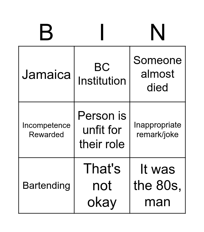 This bingo card has a free space and 14 words: Free!, People in positions of power that shouldn't have power, Bartending, BC Institution, Incompetence Rewarded, It was the 80s, man, Indecent behaviour/exposure, Complete shift in values, That's not okay, Jamaica, They were in a union, Inappropriate remark/joke, Someone almost died and Someone should have died.