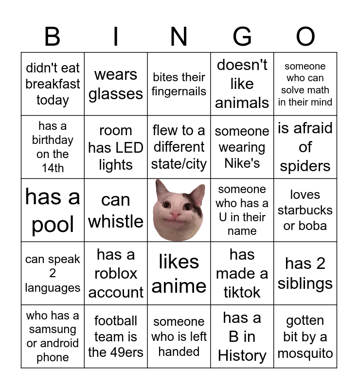 This bingo card has a free space and 24 words: has a roblox account, football team is the 49ers, flew to a different state/city, who has a samsung or android phone, someone who can solve math in their mind, didn't eat breakfast today, has a birthday on the 14th, wears glasses, someone who has a U in their name, likes anime, someone wearing Nike's, has a pool, has made a tiktok, has 2 siblings, room has LED lights, has a B in History, loves starbucks or boba, bites their fingernails, is afraid of spiders, can whistle, gotten bit by a mosquito, can speak 2 languages, doesn't like animals and someone who is left handed.