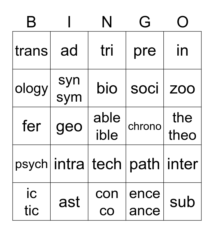 This bingo card has a free space and 24 words: intra, ast, bio, ic tic, in, trans, ology, ad, chrono, tech, soci, fer, path, inter, syn sym, ence ance, the theo, tri, zoo, geo, sub, psych, pre and con co.